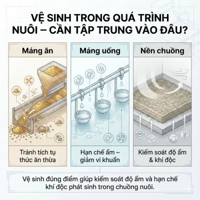 Trước khi thả gà mới, chuồng cần được làm sạch và khử trùng toàn diện để loại bỏ mầm bệnh còn sót lại từ lứa trước. Trong quá trình nuôi, việc vệ sinh tập trung vào các khu vực dễ bẩn như máng ăn, máng uống và nền chuồng, nhằm kiểm soát độ ẩm và hạn chế khí độc phát sinh. Sau khi xuất chuồng, toàn bộ hệ thống cần được tổng vệ sinh và để trống chuồng đủ thời gian kỹ thuật trước khi bước vào chu kỳ mới.