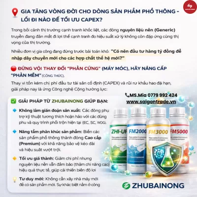 Một trong những rào cản lớn nhất của các đơn vị sản xuất BVTV là rủi ro tài chính khi đầu tư vào dây chuyền công nghệ mới. Các hợp chất của Zhubainong như dòng ZS (ZS-3, ZS-4, ZS-5) và dòng SK (SK-01, SK-02) được thiết kế để: