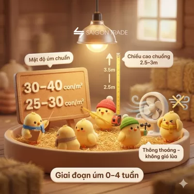 Chỉ cần nền ẩm hoặc thiếu oxy trong 24–48 giờ đầu, tỷ lệ mắc CRD và bệnh hô hấp sẽ tăng mạnh. Đây là giai đoạn nhạy cảm nhất, nên kích thước và thông gió phải đảm bảo chuẩn ngay từ đầu.