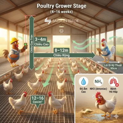 Ở giai đoạn này, mật độ nên duy trì khoảng 30–40 con/m² đối với gà thịt và 25–30 con/m² với gà đẻ hậu bị. Chiều cao chuồng tối thiểu 2,5–3m giúp thoát hơi nước nhanh, hạn chế ẩm nền. Khoảng cách nền – mái và hệ thống quạt cần được bố trí sao cho luồng khí lưu thông nhẹ nhàng, tránh gió lùa trực tiếp vào gà.