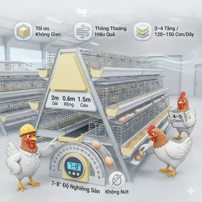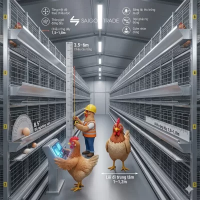 Chiều cao tổng thể từ 3,5–6m tùy số tầng (3–8 tầng). Chiều rộng dãy lồng thường 1,5–1,8m. Lối đi trung tâm rộng 1–1,2m để kỹ thuật và xe thu trứng di chuyển dễ dàng. Độ nghiêng sàn ở mức tối ưu 8,5° cho hệ thống thu trứng băng tải.