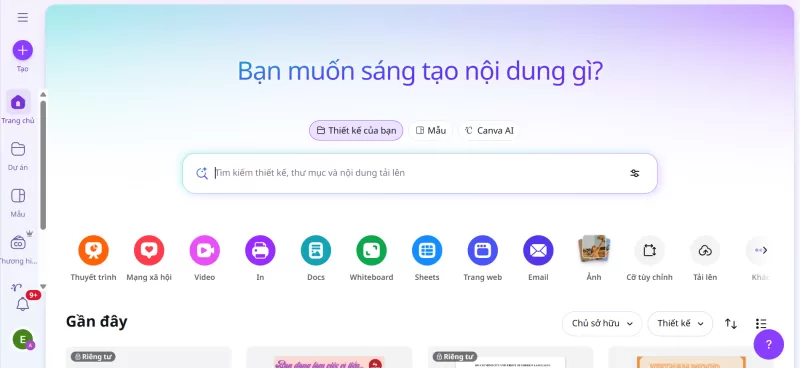Canva có bố cục rõ ràng với thanh công cụ bên trái chứa các mục quan trọng như “Thiết kế” (mẫu có sẵn), “Thành phần” (ảnh, icon, hình khối), “Văn bản”, “Dự án” (các thiết kế của bạn) và “Tải lên” (ảnh/video riêng).
