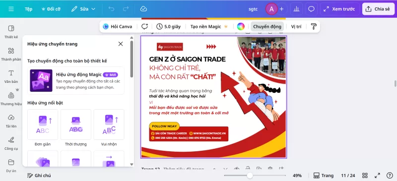Sử dụng hiệu ứng ảnh & video: Canva cung cấp các hiệu ứng (như đổ bóng, phác thảo, ghép khung) và bộ lọc ảnh chuyên nghiệp. Hãy thử áp dụng các hiệu ứng này cho ảnh của bạn. Với video, thực hành cắt ghép, thêm nhạc nền, chuyển cảnh và văn bản động để tạo ra một video ngắn (ví dụ: video quảng cáo sản phẩm 15 giây).
