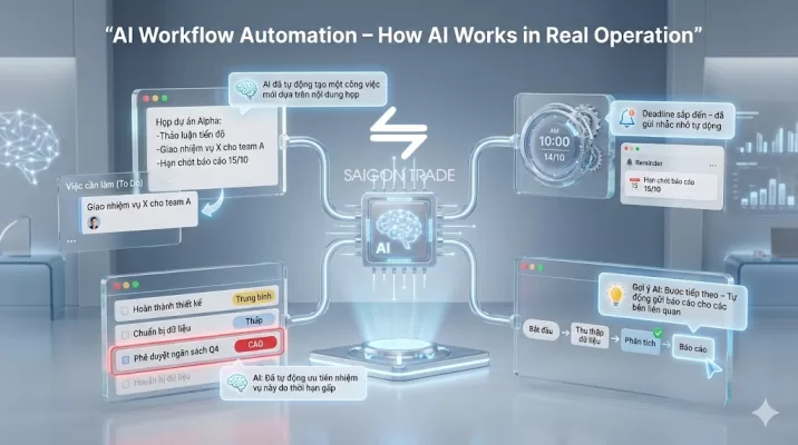 Mô phỏng hệ thống AI Workflow Automation của Saigon Trade – bộ não tự động hóa giúp doanh nghiệp nâng hiệu suất vận hành gấp nhiều lần.