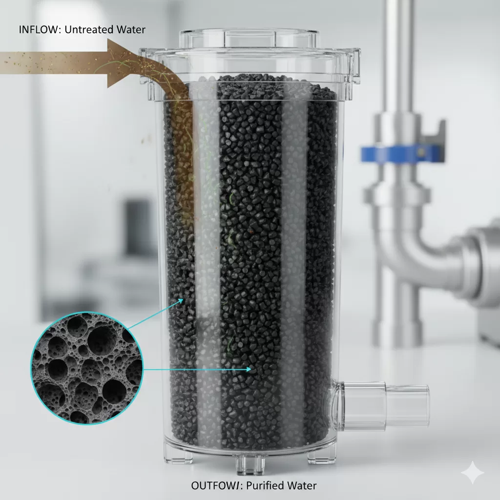 Cơ chế chính của than hoạt tính là hấp phụ vật lý, nghĩa là các phân tử ô nhiễm bị giữ lại trên bề mặt của các lỗ xốp cực nhỏ. Khi nước chảy qua lớp than hoạt tính: